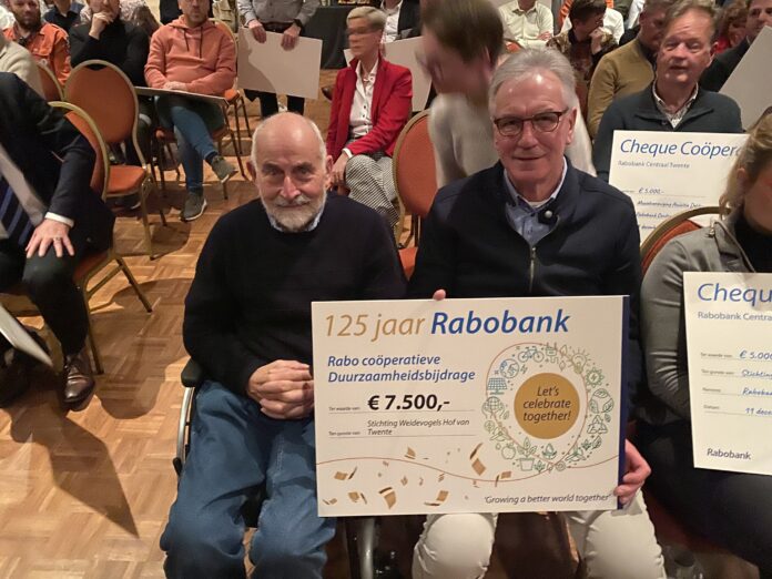 Na de gemeente Hof van Twente en de Agrarische Natuurvereniging Hooltwark heeft nu ook de Rabobank een forse subsidie beschikbaar gesteld aan de stichting Weidevogels Hof van Twente voor het redden van weidevogels in Hof van Twente. Directeur Robin Geerdink van de Rabobank Centraal Twente overhandigde dinsdagavond 19 december een cheque van 7500 euro aan voorzitter Herman Kraak en penningmeester Willy Olde Meule van de stichting Weidevogels Hof van Twente. Dat gebeurde in het Brookshoes in Bornerbroek waar de bank in het kader van het 125-jarig jubileum extra in de buidel tastte om lokale, vooral duurzame initiatieven te steunen.