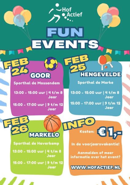 Tijdens de voorjaarsvakantie organiseren de Buurtsportcoaches van Hof Actief de ‘Fun Events’ in Goor, Hengevelde en Markelo. Kinderen van verschillende leeftijden kunnen hier kennis maken met en deelnemen aan diverse sport- en spelactiviteiten. Daarnaast bieden lokale sportverenigingen clinics aan tijdens deze evenementen.