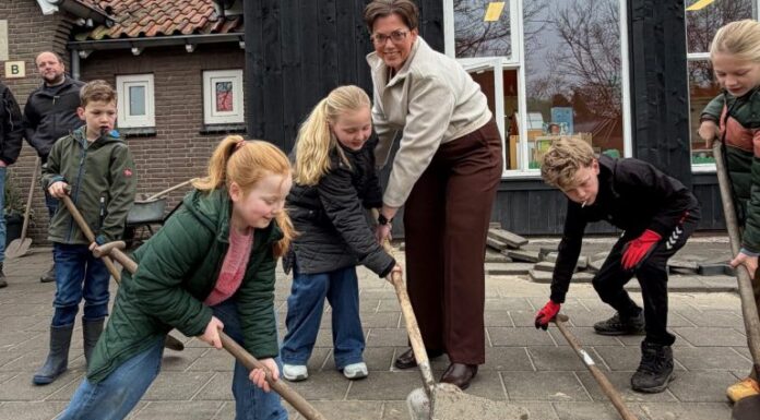 De gemeente Hof van Twente is op zaterdag 28 maart officieel gestart met het NK Tegelwippen 2026. Wethouder Miriam Doeschot gaf het goede voorbeeld door bij OBS Azelo samen met leerlingen, ouders en leerkrachten de eerste tegel uit het schoolplein te verwijderen. Hiermee neemt de gemeente opnieuw deel aan de landelijke strijd om zoveel mogelijk verharding te vervangen door beplanting, een initiatief waar iedere inwoner aan kan bijdragen.