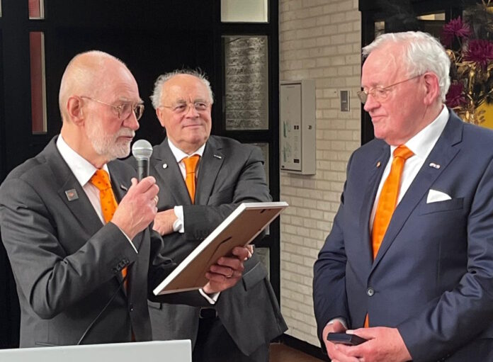 Goor, Tijdens de informele bijeenkomst van de Goorse Oranje Vereninging in de Reggehof. Werden de gedecoreerden toegesproken door voorzitter Henk Meijerink en Dhr Slagboom van de Koninklijke Bond van Oranjeverenigingen. In Goor waren er drie dames die gisteren benoemd zijn tot Lid in de Orde van Oranje Nassau.