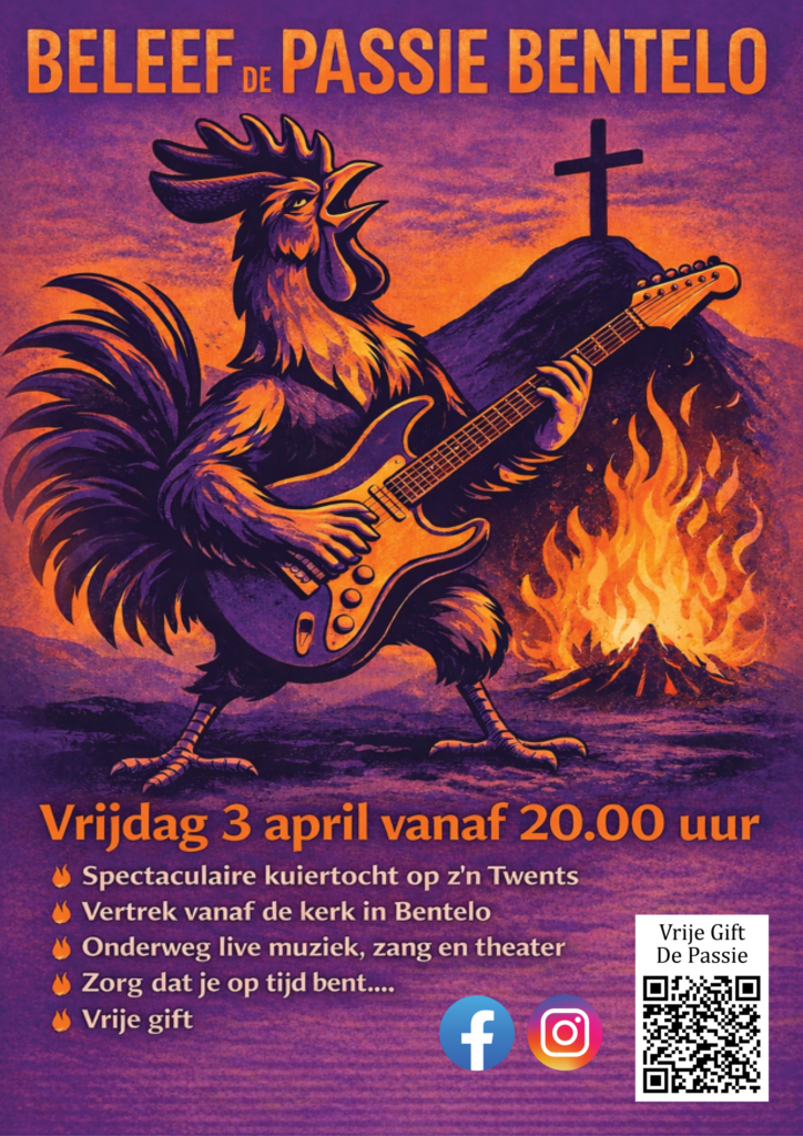 Op Goede Vrijdag 3 april 2026 opent de kerk in Bentelo om 20:00 uur haar deuren voor De Passie 2026, een eigentijdse en Twentse interpretatie van het lijdensverhaal van Jezus. Het evenement biedt een combinatie van live muziek, zang en theater, uitgevoerd door lokale inwoners met professionele ondersteuning. Het verhaal begint in de kerk en eindigt bij de Paasparty-tent, waarbij het publiek wordt uitgenodigd om mee te lopen langs een route van ongeveer 500 meter, inclusief een passage door de wijngaard en langs de ‘poasboaken’.